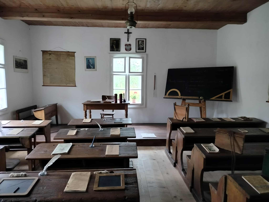 Pierwsza część wycieczki odbyła się w plenerze. Skansen położony jest w pięknym, rozległym parku. Idąc alejkami zwiedziliśmy stare zabudowania gospodarcze, kurną chatę, stary dwór i cerkiew. Szczególne zainteresowanie wśród dzieci wzbudziła szkoła sprzed II wojny światowej.