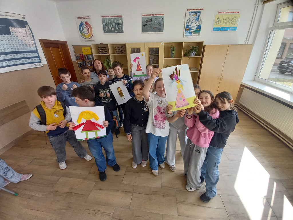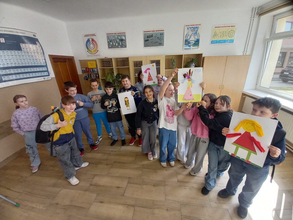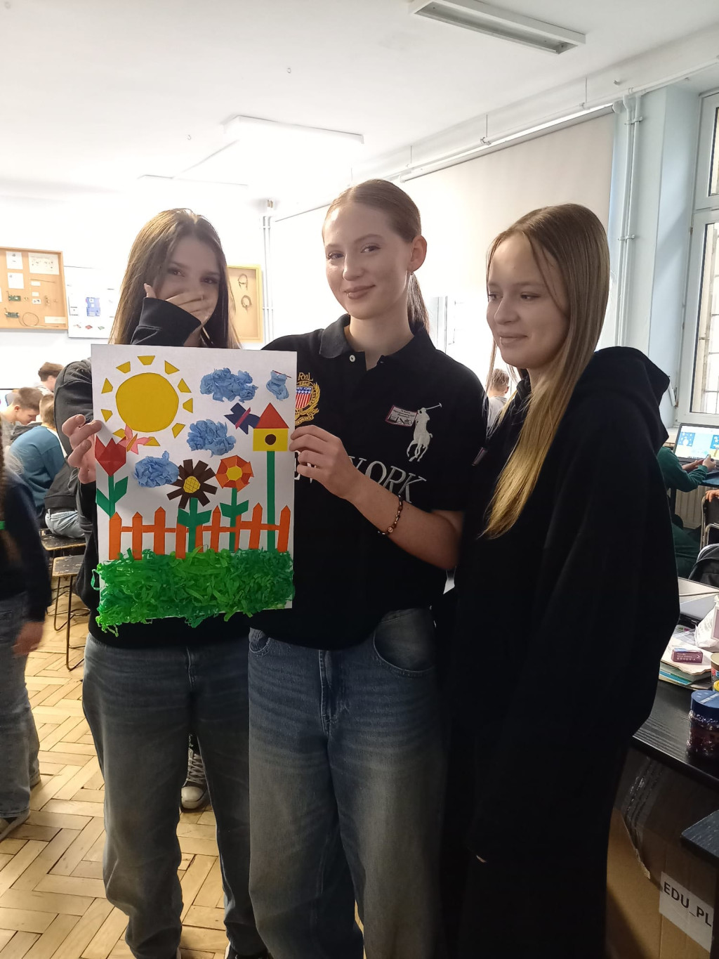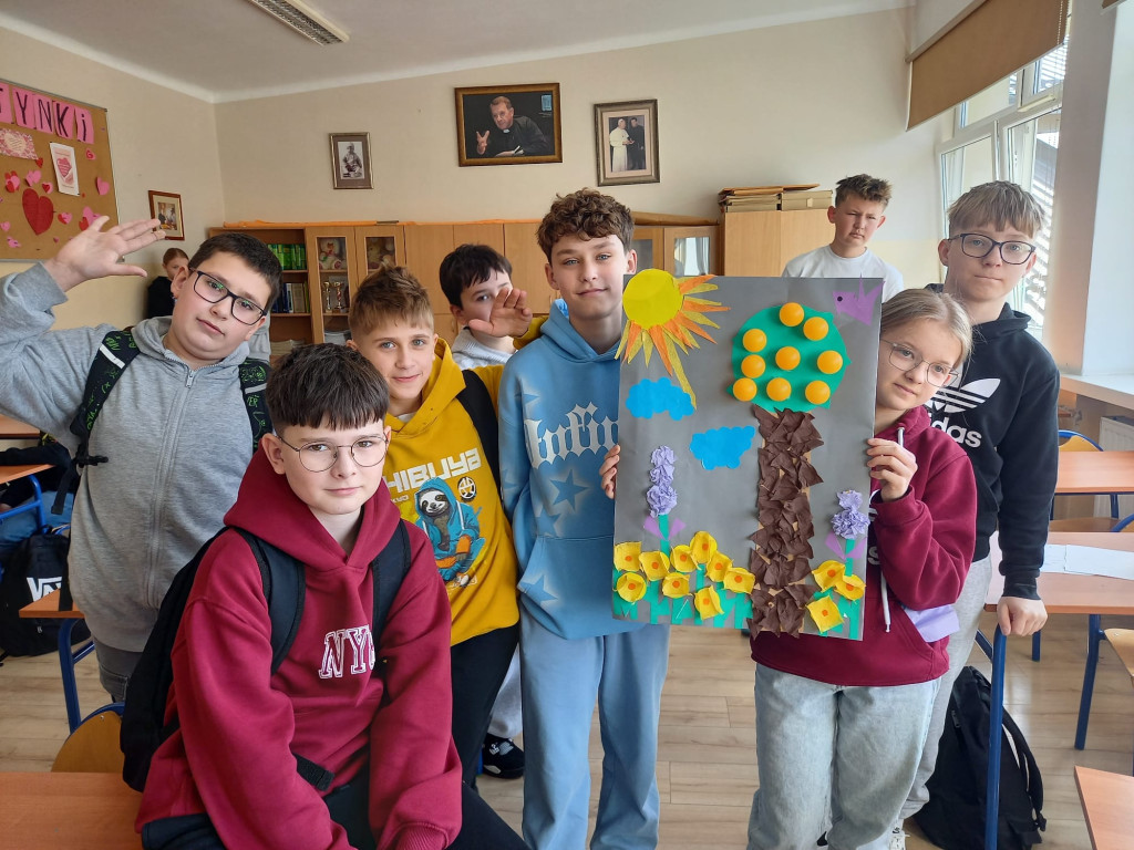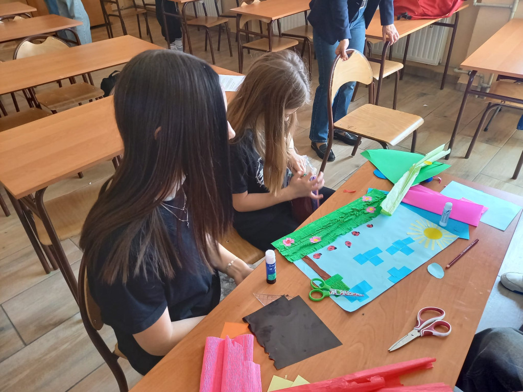 Ostatnia godzina lekcyjna była twórczą pracą nad plakatem o tematyce wiosennej. Na rysunku musiały pojawić się tylko figury geometryczne w formie wycinanek. Do wykonania swojego zadania uczniowie potrzebowali: kleju, papieru kolorowego, bibuły, krepiny, nożyczek, przyborów geometrycznych.