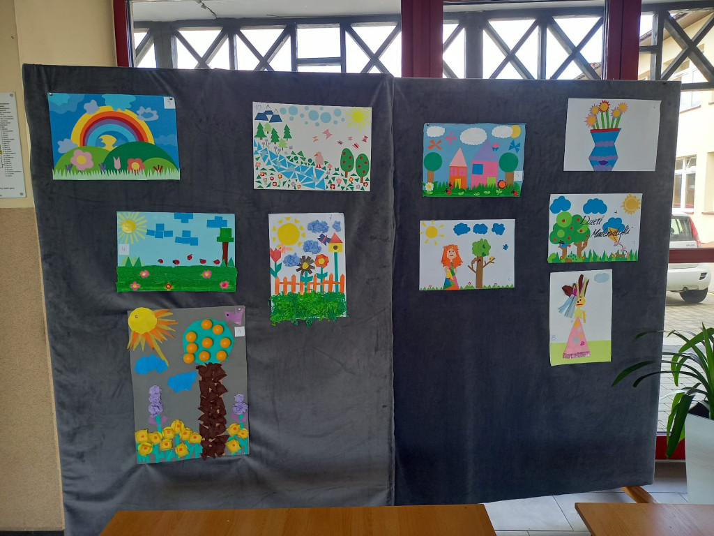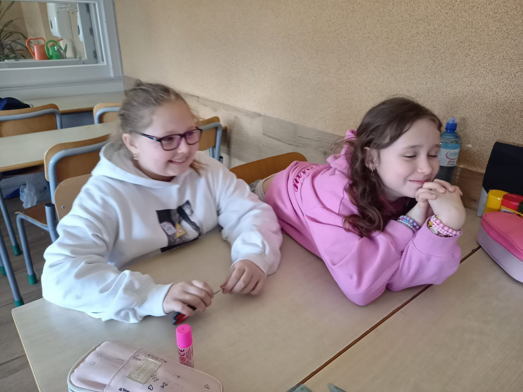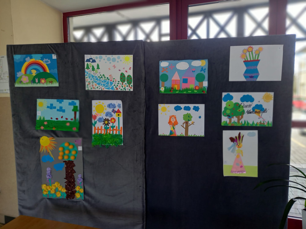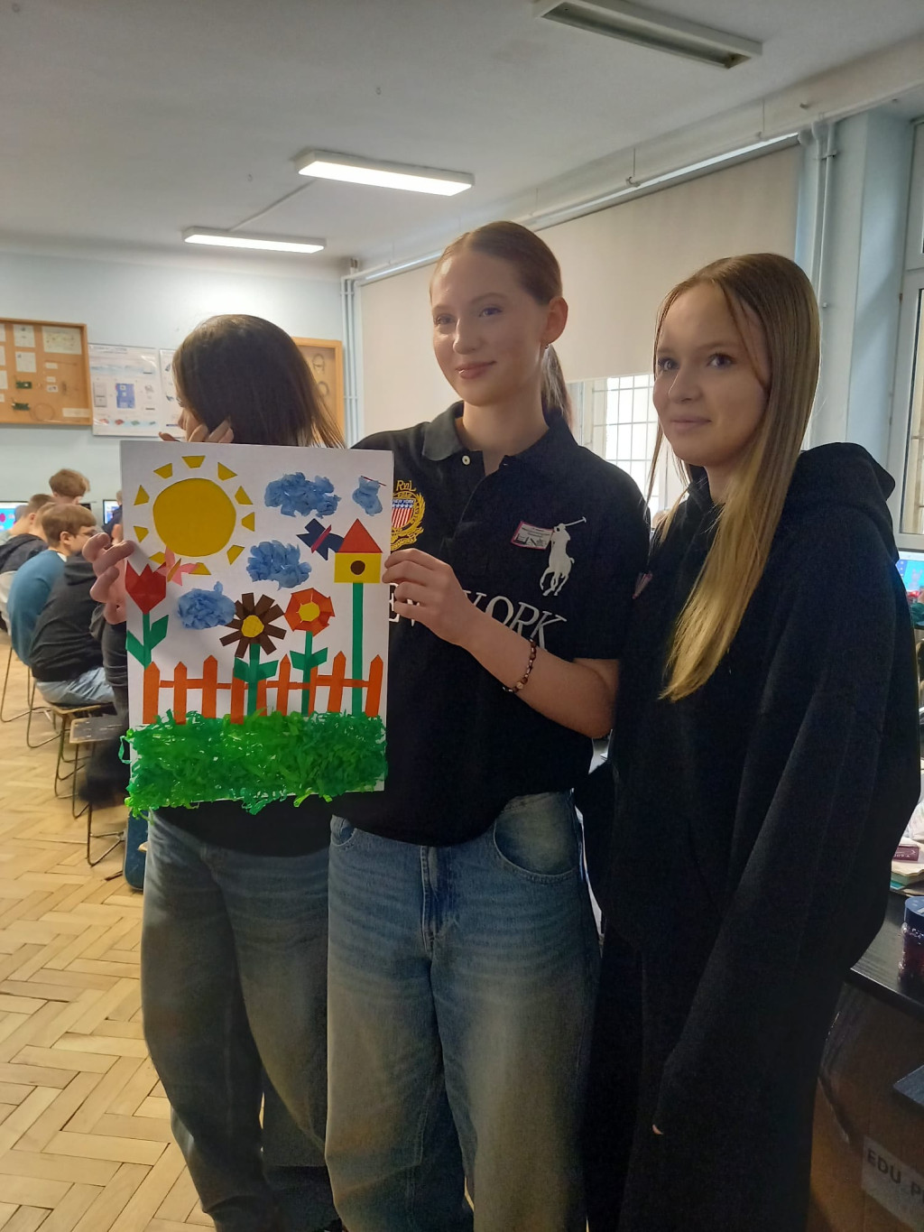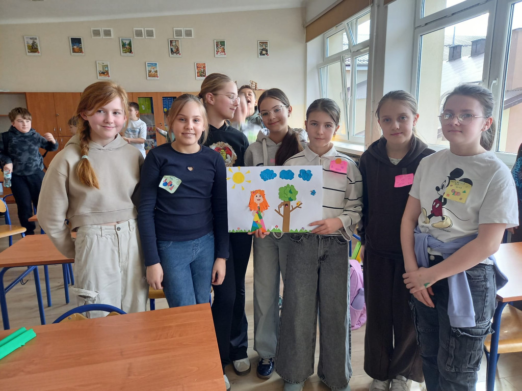 Ostatnia godzina lekcyjna była twórczą pracą nad plakatem o tematyce wiosennej. Na rysunku musiały pojawić się tylko figury geometryczne w formie wycinanek. Do wykonania swojego zadania uczniowie potrzebowali: kleju, papieru kolorowego, bibuły, krepiny, nożyczek, przyborów geometrycznych.